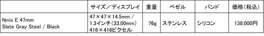 ・その他の機能:タッチスクリーン(オンオフ切り替え可能)、LEDフラッシュライト(『fēnix E』は非対応)、スピーカー&マイク(『fēnix E』は非対応)、センサーガード(『fēnix E』は非対応)
