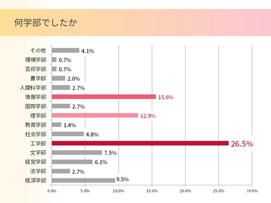 ITエンジニアになる前に大学生だった方に学部をたずねたところ、最も多かったのは工学部で26.5%、続いて情報学部の15.6%、理学部の12.9%と、上位3学部は理系学部でしたが、4位以降は経済学部(9.5%)や文学部(7.5%)など文系の学部が続きました。
