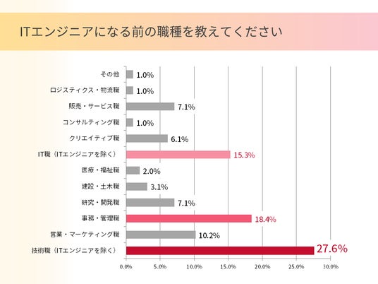 会社員からの転職の方に元の職種をたずねると、技術職(ITエンジニアを除く)が27.6%で最も多く、次に事務・管理職の18.4%が続きました。