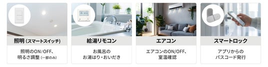 住戸内にはIoT対応の「スマートスイッチ」「給湯リモコン」「エアコン」が全住戸に標準装備されており、「HOMETACT」からスマートロックとこれらの機器をまとめて制御することが可能です。