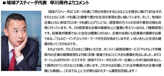 沖縄県内外のスポンサー企業に“オンライン保険診療”を提供し健康経営に貢献!琉球アスティーダがアルゴスと「健康経営推進パートナーシップ」を締結