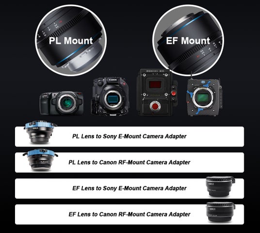 SIRUI Jupiter シリーズはネイティブ PL/EF マウントで提供されており、市場の多くのプロ用シネマと互換性があります。E マウントおよび RF マウント アダプターは、幅広い人気のフルフレーム ミラーレス カメラで使用できます。
