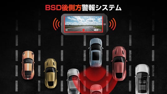 左後方の車両接近、画面上の赤枠表示とアラーム音で警告