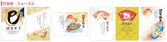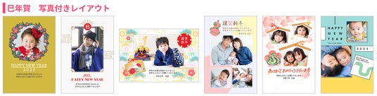 選択可能なレイアウト:年賀状、暑中見舞い、往復はがき、喪中・欠礼、実用・ビジネス、お知らせ、お礼、イベント・行事