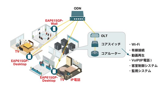 ・通信環境・サービスを向上化: 光信号を分岐させることで、1本の光ファイバーを複数箇所で共有するP2MPが可能。各客室やフロント、レストランなどホテル内にネット環境とより快適なサービスを提供します。