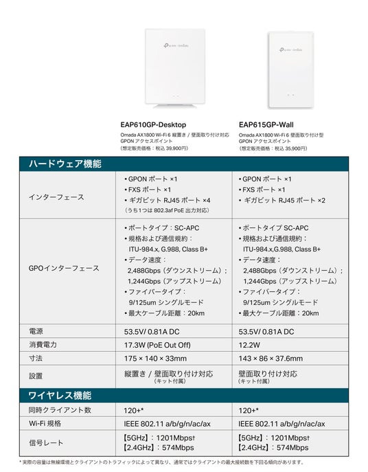 「EAP615P-Wall」「EAP610P-Desktop」はどちらも、AX1800 Wi-Fi 6 GPONアクセスポイントです。PC・TV・IP電話を光ファイバーケーブルで繋げば、有線接続・Wi-Fi・ 音声通信・VoIP・データ通信・HD対応動画など、幅広いサービスが利用可能に。また、GPON Wi-Fi 6テクノロジーを活用した最大1.8Gbps(574Mbps(2.4GHz)+1201Mbps(5GHz))*1の高速通信で、強力でシームレスなネットワークを実現します。