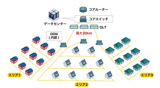 ・ODN(光配線ネットワーク)とは、光ファイバーケーブルや受動光分配器などの受動光デバイスで構成されるネットワークで、光信号をOLT(光回線終端装置)とONU(光ネットワーク端末)間で伝送します。基本的に、光信号の分配や伝送を行う役割を担っています。
