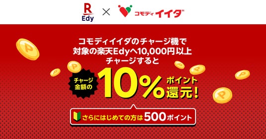 さらに、キャンペーン期間中に「コモディイイダ」店舗に設置しているチャージ機で初めて「コモディイイダEdy-楽天ポイントカード」へ10,000円以上チャージした方に、もれなく「楽天ポイント」500ポイントを進呈します。