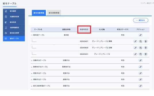これにより、過去分の改定履歴をジンジャー内に保持できるようになります。また、以下画像のような「2024/08/20」と「2024/4/1」にテーブルを改定した場合に、その地点の履歴データを取得して、給与単価へその単価を登録することができます。