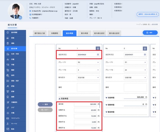 また、給与単価の「改定年月日」を選択すると、データベース上に登録されている人事情報を参照して、テーブルと連携している支給単価(控除単価)に自動で金額が入ります。