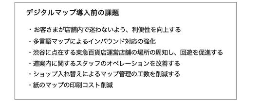 東急百貨店は、渋谷ヒカリエや渋谷スクランブルスクエアなど大規模複合施設への出店など、渋谷において合計約9,700平方メートル の面積に約240ショップで構成する「食の4拠点」を展開しています。東急百貨店の各店舗がどこにあるか、各店舗内のショップがどこにあるかを周知するため、各大規模複合施設が設置するフロアマップに加え、自社起点で発信できるマップの必要性がありました。またマップの多言語化や管理工数削減等、関連する複数の課題解決のためにデジタルマップの導入を決定しました。