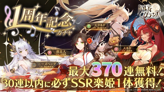 ◆ 8月29日(木)より、最大370連無料!30連以内に必ずSSR楽姫1体獲得できる「1周年記念ガチャ」や「1周年記念商品」の販売、豪華報酬がゲットできる「1周年ログインボーナス」などを開催!