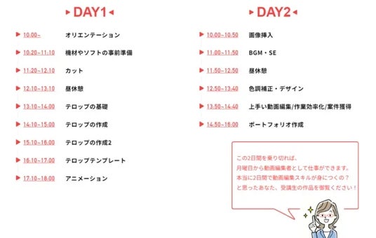 講座は2日間で動画編集ができるようになる実践的なカリキュラム内容となっています。最後には、受講者の実績となるポートフォリオとして自己紹介動画を作成するので、月曜日から営業活動が可能です。