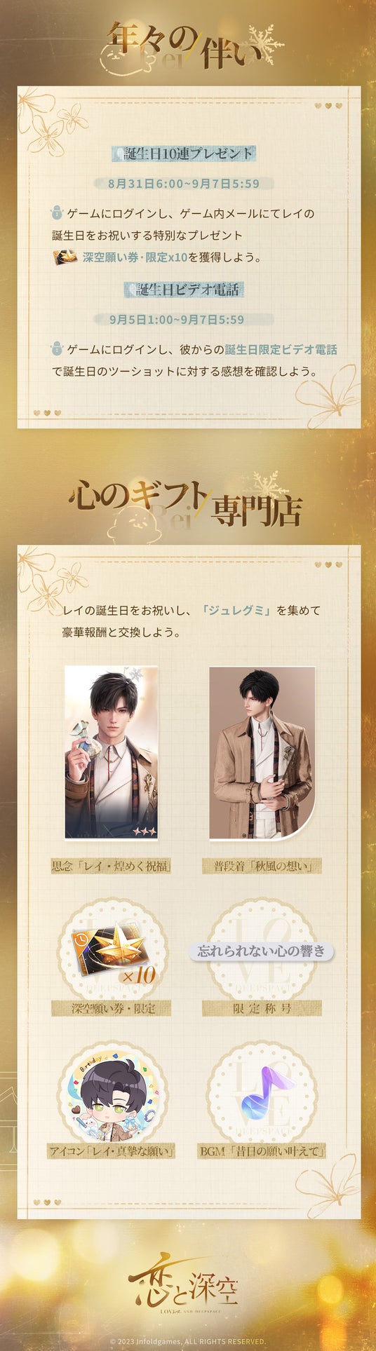 INFOLD PTE. LTD.は、全世界1億DLを突破した『恋とプロデューサー』の世界観を継承した完全新作恋愛シミュレーションゲーム『恋と深空』において、8月31日(土)6時よりレイ誕生日イベント「年々の誓い」を開催することをお知らせいたします。