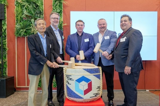 竣工式にて(左より)ESR取締役 松波秀明、データセンターCEOディアミッド・マセイ、代表取締役 スチュアート・ギブソン、ジャパンデータセンター責任者 フランク・ボイランド、データセンターCCO ジョナサン・ショケット