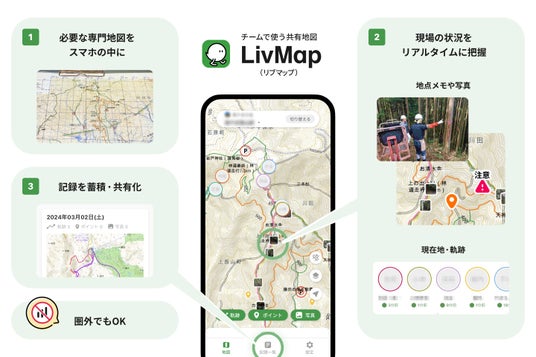 LivMap は、森林計画資料等を背景地図として、写真・現地メモ・現在位置・軌跡などの情報をチーム内で共有化することで、林業の施業適地探索・現地調査業務を効率化できるアプリです。 三重県では、林業担当部局と連携の上、森林計画図、立体地形表現図、保安林の地図などを掲載しています。