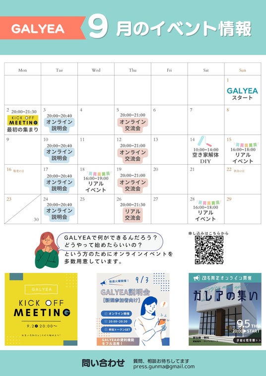 9月には、多くのイベントが予定されており、地域の魅力を発信し、地域活性化を推進する活動が活発に行われます。興味のある方はぜひ、GALYEAのイベントに参加してみてください。ご参加には下記申込みフォームから事前にお申込みをお願いいたします。