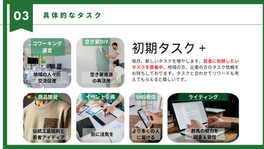 またGALYEA上に、地域の特色ある職業(キャリアパーツ)や地域活動をタスクとして掲載することでGALYEA参加者のタスクの選択肢を増やしながら、地域文化の継承と時代の流れに合わせたローカルキャリアの在り方を提案していきます。