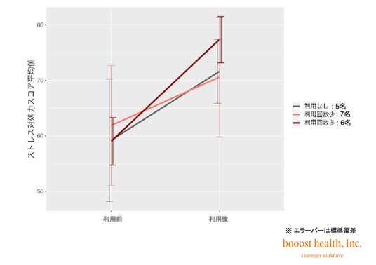 別の企業の18名を対象に追加調査を実施したところ、期間中の利用回数にばらつきが見られました(最大8回)。そこで、利用なし・利用回数少(5回未満)・利用回数多(6回以上)の3つのグループで、ストレス対処力** のスコア変化を比較しました。その結果、利用回数が多かった参加者でストレス対処力が特に大きく向上していました。「メンタルトレーニングクラブBOOOST」の積極利用が効果的なストレス対処につながる可能性が示唆されます。