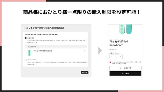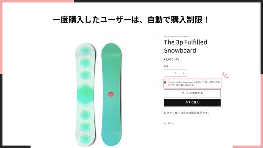 「シンプルおひとり様一点限りの購入制限設定」では、購入制限設定された商品を一度購入したユーザーに対して、その商品の購入を自動で制限します。
