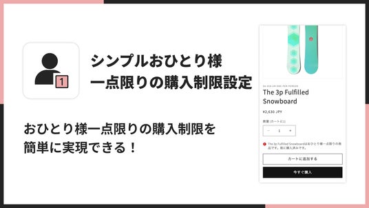 「シンプルおひとり様一点限りの購入制限設定」は、Shopify ストアでおひとり様一点限りの購入制限を簡単に実現できるアプリです。