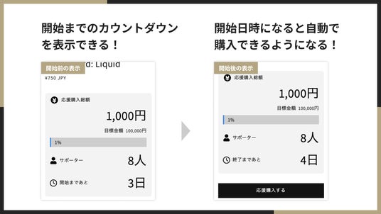 「シンプルクラウドファンディング|お手軽自社クラファン」を使うと、クラウドファンディング開始までのカウントダウンを表示でき、開始日時になると自動で購入ボタンを表示できます。