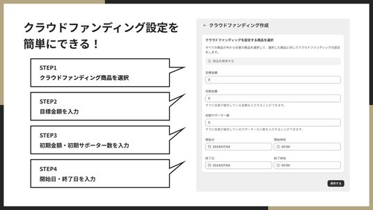 商品を選択し、いくつかの項目を入力するだけで、クラウドファンディング設定を作成可能