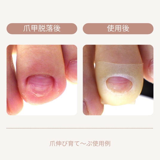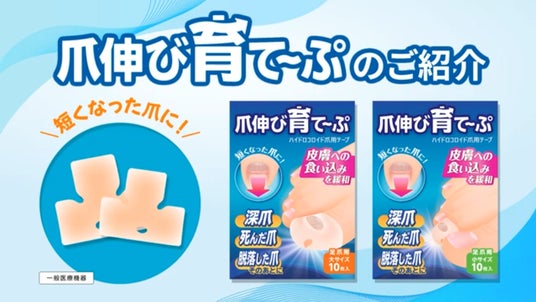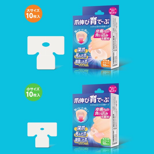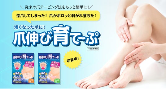 弊社考案の「爪伸び育て~ぷ」は、深爪や爪が剥がれるなどして短くなった爪、いわゆる“爪が死んだ”状態に対して使用するセルフケア用のテープです。このテープは、爪の食い込みによる痛みを緩和し、伸長障害による爪の変形対策が未然に行えます。