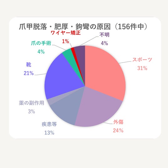 当院における爪甲脱落や爪の変形が著明となる“肥厚爪”や“爪甲鉤彎症”、その元となる”爪甲脱落”の原因を記したグラフ。その原因は日常生活において誰にでも起こりえるものが大半を占める。