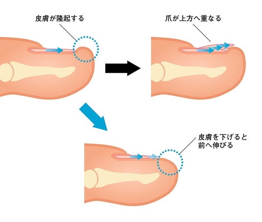爪が剥がれた、もしくは深爪状態の短くなったままでいると、爪が皮膚に食い込み、前方に伸長することが困難となり変形が始まります。