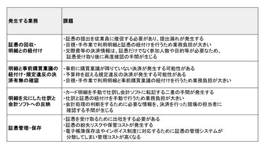 以下の表は、経費精算時に発生する経理担当者の業務とその課題を示しています。