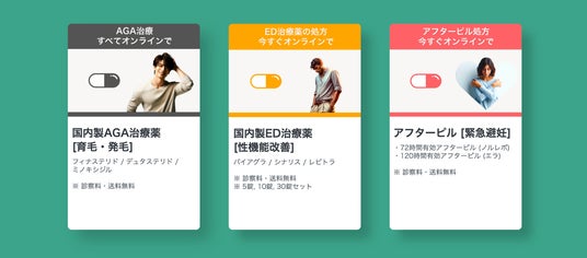 当サービスは、現在3つの自由診療メニュー(AGA治療・ED治療・アフターピル処方)に対応しています。