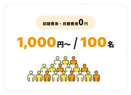 最低人数100名、1,000円~のアンケート実施が可能です。初期費用と月額費用は不要で、回収した数に応じて費用が発生する従量課金です。