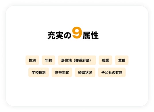 充実の9属性で配信のセグメントができることにより、確実性の高いリサーチデータを取得できます。