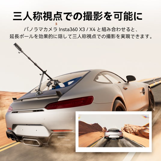 パノラマカメラ・アクションカメラ用車載吸盤マウントキット4380は、パノラマ車載撮影のために特別に設計されており、低高度のドローン撮影のような効果を実現します。パノラマカメラInsta360 X3/X4と組み合わせると、延長ポールを効果的に隠し、三人称視点での撮影が可能になります。(*100km/hの速度で最大0.5kgまで支えることができます。)
