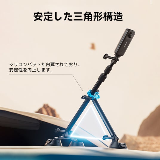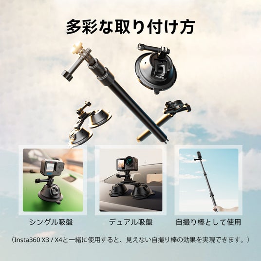 シングル吸盤やデュアル吸盤など、様々な取り付け方法で使用でき、様々なニーズに対応可能です。Insta360 X4/X3、GoPro12/11/10/9、DJI Action 4/3など多くのパノラマカメラ、アクションカメラに対応できます。延長ポールは取り外して自撮り棒としても単独で使用でき、Insta360 X3/X4と組み合わせることで、見えない自撮り棒の効果も実現できます。