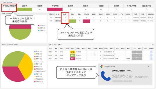管理者は、折り返し呼の登録時に通知が受け取れることに加え、詳細情報の確認・変更もでき、センター全体のコールバック業務の一元管理をすることができます。また、稼働状況モニタリング(センター全体のコール状況や、オペレーターの業務ステータスが一覧で把握できる機能)から未対応の折り返し件数も把握できるので、対応の抜け漏れ防止も実現します。