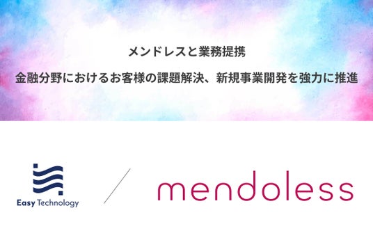 株式会社 Easy technology(東京都新宿区、代表取締役:三宅俊也、以下「 Easy technology」)は、株式会社メンドレス(東京都渋谷区、代表取締役: 新関 広樹、以下、「メンドレス」、)と業務提携したことをお知らせいたします。
