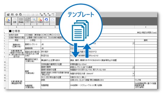 テンプレート選択して(構造)仕様表を作成。書式や項目を自由に編集して登録・利用することで作業効率も向上。