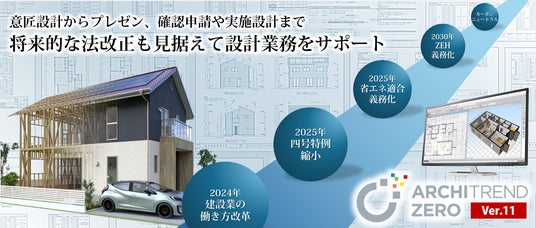 建設業の働き方改革で生産性向上が求められている中、意匠設計からプレゼン・確認申請・実施設計まであらゆる設計図書を自動作成して手戻りのない設計フローを実現するARCHITREND ZEROでは、2025年4月施行予定の省エネ基準適合義務化や四号特例縮小などに対応した大幅なバージョンアップを行い、今後必須となる省エネ設計・構造設計への取り組み推進ならびに業務効率化を支援いたします。