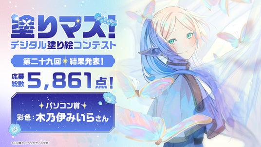 第二十九回は、『週刊少年サンデー』にて絶賛連載中の「葬送のフリーレン」に登場する4人の旅の仲間たちの塗り絵をお題として、素敵な作品を多数ご応募いただきました。応募数はイラスト4,601点、タイムラプス動画1,260点の合計5,861点となりました。