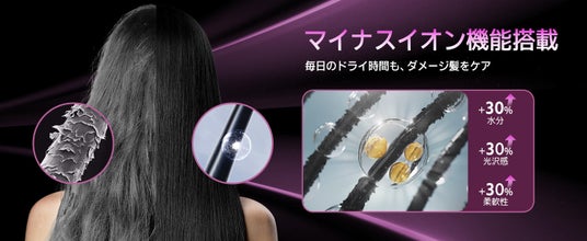 このドライヤーは、最新の高濃度マイナスイオン技術を採用し、毎回最大2億個のイオンを放出します。毛先から根元まで栄養を与え、髪のダメージを修復・保護。静電気を抑え、髪に自然な輝きと弾力を与えます。どんな状況でも自信を持って美しい髪を表現できます。