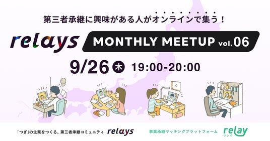 【オンライン交流会】第三者承継コミュニティ「relays(リレイズ)」、事業承継について気軽に話せるイベント「relays MONTHLY MEETUP vol.6」開催決定!9月26日(木)開催。