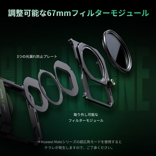 67mmフィルタープレートは取り外し可能なモジュール式の設計を採用し、各機種のスマホレンズの位置に合わせて調整することができるほか、異なるスマホ機種に専用の遮光ソリューションも提供し、フィルターの光漏れを減らします。