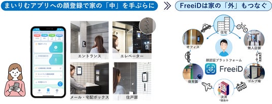「LIM Cloud×FreeiD」連携により、「まいりむアプリ」に顔情報を1度登録するだけで、マンションの「中」をオール顔認証で過ごせる暮らしを本物件で実現。今後は、保育園での本人確認、店舗での決済等、マンションの「外」(外部施設)での暮らしにも活用の可能性を拡げてまいります。