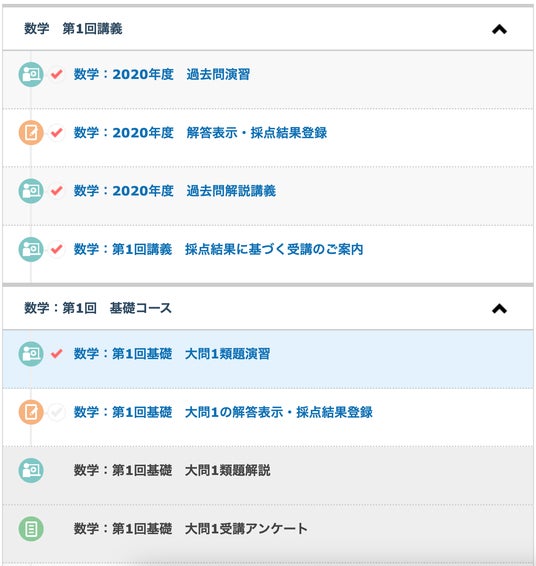 指定書籍に対応した過去問全問解説講義と予想テスト全問解説講義は、各年度、教科、大問単位で全問の解説を用意します。また、各講義の弱点補強問題は、大問単位で基礎・標準・発展の習熟度別3コースそれぞれのコースに1問ずつ計3問を用意します。例えば、大問が6問あった場合は、基礎・標準・発展の習熟度別3コース合計18問の弱点補強問題演習を用意します。弱点補強問題演習講義は、弱点補強問題の全問を解説します。