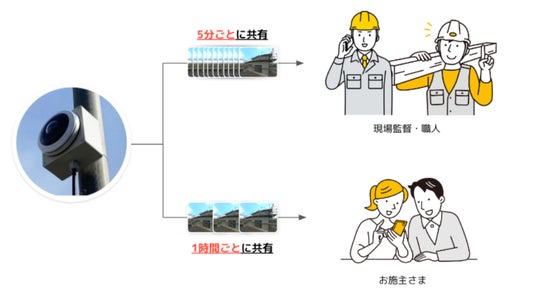 コネクトカメラは、現場の屋外や屋内に定点カメラを設置し、1分間隔または5分間隔で自動的に写真を撮影してクラウド保存するサービスになっています。これまでも、コネクトカメラには職人や施主に映像を共有する機能が搭載されており、アプリを通じて現場映像を確認することが可能でした。