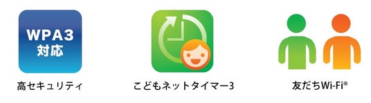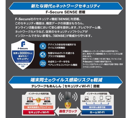 ※1:本機能はルーターモード時のみ使用可能です。また、専用アプリ「SENSE」をインストールする必要があります。無料ライセンス期間(1年)終了後は、ライセンスはF-Secureにて有償で更新可能です。ライセンス及びセキュリティ機能が自動で課金・更新されることはありません。
