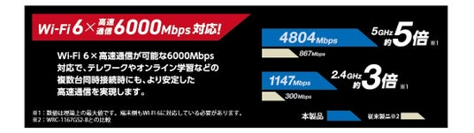 Wi-Fi 6×高速通信が可能な6000Mbps(※)対応で、テレワークやオンライン学習などによる複数台同時接続時にも、安定した高速通信を実現します。