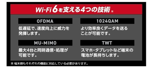 複数台接続に強いOFDMA、送信情報量をアップする1024QAM、複数台同時接続が可能なMU-MIMO、スマートフォンのバッテリーが長持ちするTWTが、快適なWi-Fi環境を実現します。